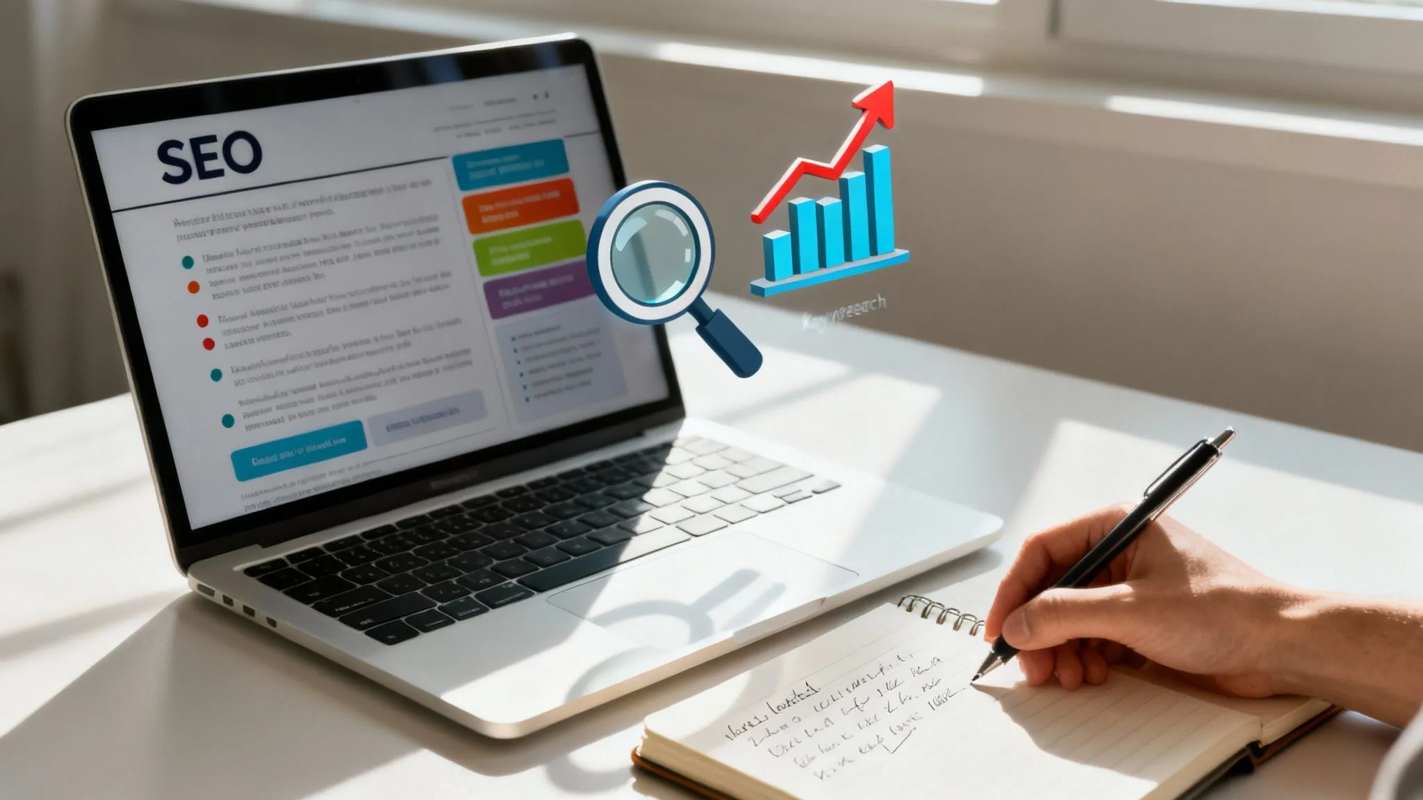 Eine Person tippt an einem Laptop, umgeben von Icons, die SEO-Elemente wie Keywords und Graphen darstellen.