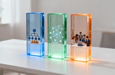 Eine Person wählt zwischen verschiedenen Optionen auf einem Bildschirm, die eine Agentur, einen Freelancer und ein Baukasten-System symbolisieren.